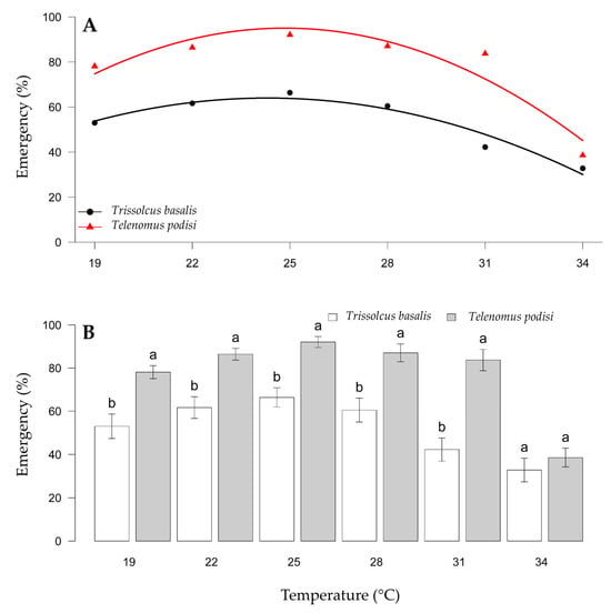 Viability of Trissolcus basalis and Telenomus podisi in frozen or fresh eggs of Euschistus heros at different constant temperatures, under laboratory conditions. Regression analysis examining the temperature effect for each parasitoid (A). Comparison of emergence between parasitoids within each temperature (B). Averages with lowercase letters (comparison within each temperature) do not differ statistically according to the F test (p > 0.05).