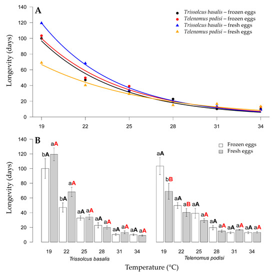 Longevity (days) of Trissolcus basalis and Telenomus podisi parasitizing frozen or fresh eggs of Euschistus heros at different constant temperatures, under laboratory conditions. Regression analysis for each combination of parasitoids and egg types (A). Comparison of parasitoid longevity in each combination of temperature and type of egg (B). Averages with lowercase letters compare eggs within species, black uppercase letters compare species parasitizing frozen eggs, and red uppercase letters compare species parasitizing fresh eggs. In all cases, the F test was applied for statistical differences (p < 0.05).