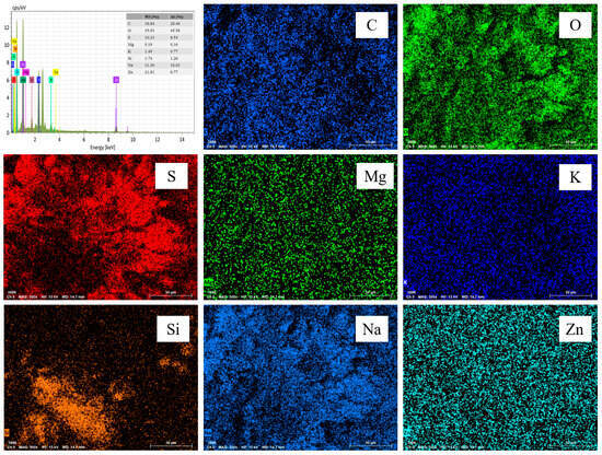 The foliar Zn fertilizer used in this study was prepared according to Tang et al. [19] with some modifications: 125 g ZnSO4.7H2O (Sinopharm, Shanghai, China) was dissolved using a 150 mL a commercially available amino acid fertilizer (Kangso 1#, Kangso, Huzhou, China). Then, 100 mL of nano emulsion (Nano Green, Livermore, CA, USA) with a micelle size range of less than 100 nm was added and mixed thoroughly. The elemental composition of the foliar Zn fertilizer was determined via energy dispersive X-ray (EDS, XFlash®6|30, Bruker, Berlin, Germany) analysis. The results showed that the foliar Zn fertilizer consisted of carbon (C), oxygen (O), sulfur (S), magnesium (Mn), potassium (K), silicon (Si), sodium (Na) and Zn, which accounted for 16.84%, 35.93%, 10.33%, 0.19%, 1.49%, 1.74%, 11.36% and 21.81% of the weight, respectively (Figure 1).