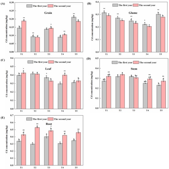 Cd concentrations in the different tissues of wheat with different treatments in two consecutive years. (A) Cd concentrations in grain, (B) Cd concentrations in glume, (C) Cd concentrations in leaf, (D) Cd concentrations in stem and (E) Cd concentrations in root. Data are the means of three replicates and error bars represent the standard error. Different letters at the top of the bars indicate significant differences among the treatments at the p < 0.05 level. * and ** indicate significant differences between the two cultivation years at the p < 0.05 and p < 0.01 levels, respectively. T1: control, application of deionized water; T2: application of the 1000-fold dilution of the foliar Zn fertilizer; T3: application of the 750-fold dilution of the foliar Zn fertilizer; T4: application of the 500-fold dilution of the foliar Zn fertilizer; and T5: application of the 250-fold dilution of the foliar Zn fertilizer.