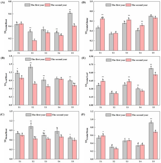 Cd translocation factors (TFs) of wheat with different treatments in two consecutive years. (A) TFGrain/Root, (B) TFLeaf/Root, (C) TFStem/Root, (D) TFGrain/Glume, (E) TFGrain/Leaf and (F) TFGrain/Stem. Data are the means of three replicates and error bars represent the standard error. Different letters at the top of the bars indicate significant differences among the treatments at the p < 0.05 level. * and ** indicate significant differences between the two cultivation years at the p < 0.05 and p < 0.01 levels, respectively. T1: control, application of deionized water; T2: application of the 1000-fold dilution of the foliar Zn fertilizer; T3: application of the 750-fold dilution of the foliar Zn fertilizer; T4: application of the 500-fold dilution of the foliar Zn fertilizer; and T5: application of the 250-fold dilution of the foliar Zn fertilizer.
