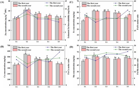 Mineral element concentrations (histogram) and bioavailability of wheat grains (line graph) with different treatments in two consecutive years. (A) Zn concentrations and the estimated Zn bioavailability, (B) Ca concentrations and PA/Ca molar ratio, (C) Fe concentrations and PA/Fe molar ratio and (D) Mn concentrations and PA/Mn molar ratio. Data are the means of three replicates and error bars represent the standard error. Different letters at the top of the bars indicate significant differences among the treatments at the p < 0.05 level. * and ** indicate significant differences between the two cultivation years at the p < 0.05 and p < 0.01 levels, respectively. T1: control, application of deionized water; T2: application of the 1000-fold dilution of the foliar Zn fertilizer; T3: application of the 750-fold dilution of the foliar Zn fertilizer; T4: application of the 500-fold dilution of the foliar Zn fertilizer; and T5: application of the 250-fold dilution of the foliar Zn fertilizer. PA, phytic acid.