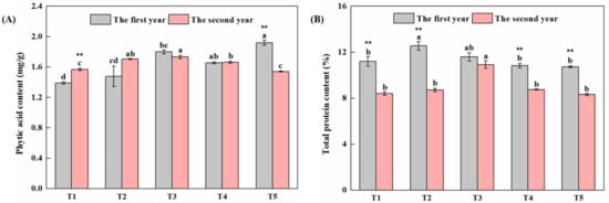Nutritional quality of wheat grains with different treatments in two consecutive years. (A) Phytic acid content. (B) Total protein content. Data are the means of three replicates and error bars represent the standard error. Different letters at the top of the bars indicate significant differences among the treatments at the p < 0.05 level. ** indicate significant differences between the two cultivation years at the p < 0.01 level. T1: control, application of deionized water; T2: application of the 1000-fold dilution of the foliar Zn fertilizer; T3: application of the 750-fold dilution of the foliar Zn fertilizer; T4: application of the 500-fold dilution of the foliar Zn fertilizer; and T5: application of the 250-fold dilution of the foliar Zn fertilizer.