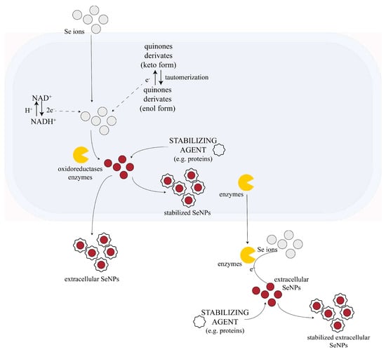 Biogenic selenium nanoparticles are synthesized using microorganisms or plants. SeNP biosynthesis can occur either intracellularly or extracellularly. Specific biomolecules of the physiological apparatus of microorganisms can carry out reducing and stabilizing functions, which are vital for SeNPs production [90]. As they provide just the right conditions for this process, microorganisms acquired a reputation as nano-factories. Their great potential also lies in the possibility of modifying their cellular machinery to facilitate SeNP synthesis [91].