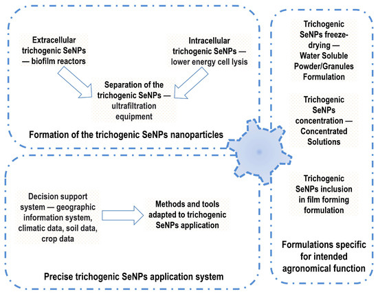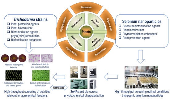 A systemic approach is needed to select the optimal Trichoderma strain and parameters for the formation of such trichogenic SeNPs sharing activities with the biological system in question—see Figure 2.