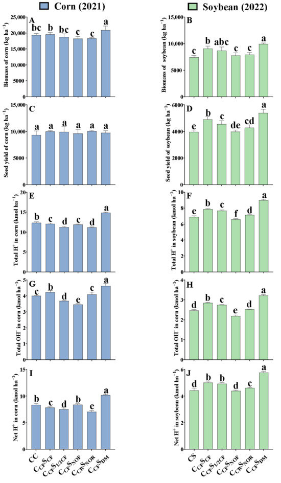 Effect of long-term management on crop biomass, seed yield, total H+, OH−, and net H+ production after 9- and 10-year treatment. (A,C,E,G,I) indicate biomass, seed yield, total H+, OH−, and net H+ production in corn per hectare after 9-year treatment (2021), respectively. (B,D,F,H,J) indicate biomass, seed yield, total H+, OH−, and net H+ production in soybean per hectare after 10-year treatment (2022), respectively. Error bars represent standard deviation (SD). Different letters above columns indicate significant differences in different treatments (p < 0.05).