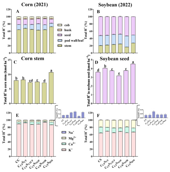 Percentage of total H+ in different tissues of corn (seed, stem, leaf, husk, and cob) and soybean (seed, stem, and pod wall) after 9- and 10-year treatment among different treatments (A,B). The total H+ production in corn stem and soybean seed (C,D). The percentage of H+ produced by corresponding cations (K+, Ca2+, Na+, and Mg2+) in corn stem (E) and in soybean seed (F) after 9- and 10-year treatment among different treatments. Error bars represent standard deviation (SD). Different letters indicate significant differences in different treatments (p < 0.05).