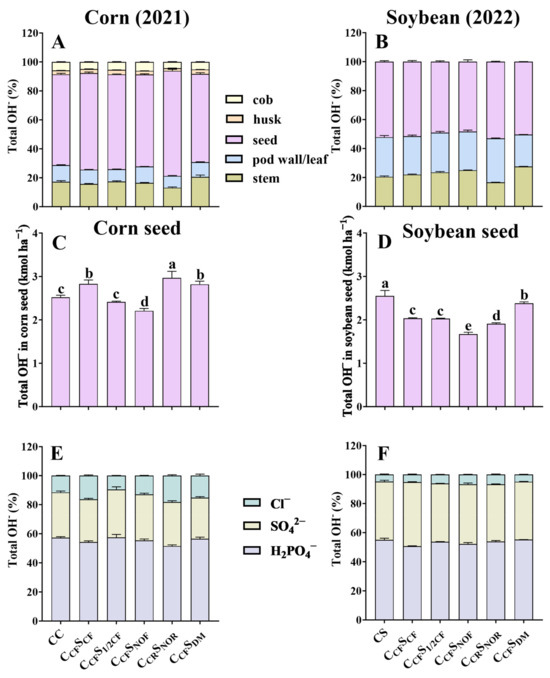 Percentage of total OH− in various tissues of corn (seed, stem, leaf, husk, and cob) and soybean (seed, stem, and pod wall) after 9- and 10-year treatments (A,B). The total OH− production in corn soybean seed (C,D). The percentage of OH− produced by corresponding anions (SO42−, Cl−, and H2PO4−) in the seed of corn (E) and soybean (F) after 9- and 10-year treatment among different treatments. Error bars represent standard deviation (SD). Different letters indicate significant differences in different treatments (p < 0.05).