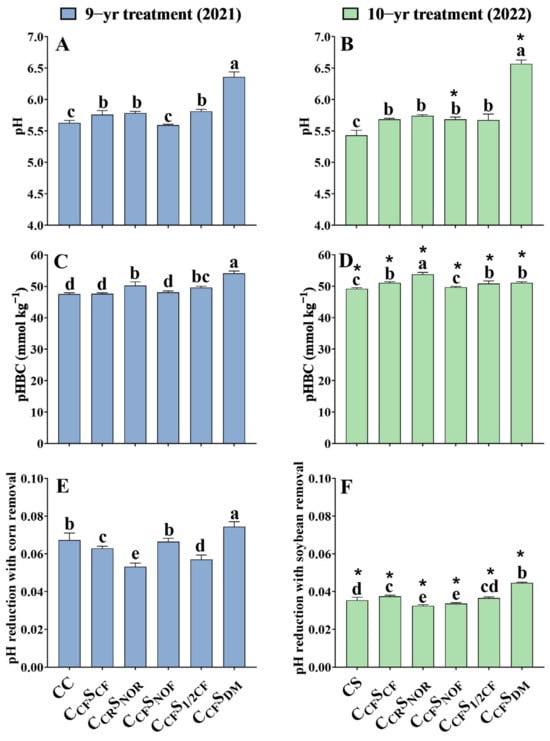 Soil pHBC in 9-year continuous corn (CC) was not affected, while that of 10-year continuous soybean (CS) was 1.89 mmol kg−1 (p < 0.05) less than CCFSCF. Under crop rotation, compared to CCFSCF, the soil pHBC in CCRSNOR, CCFS1/2CF, and CCFSDM was considerably increased by 2.63, 2.01, and 6.51 mmol kg−1 (p < 0.05) after 9-year treatment. Similarly, compared to CCFSCF, the soil pHBC in CCRSNOR and CCFSDM was considerably increased by 2.68 and 1.13 mmol kg−1 (p < 0.05), but CCFSNOF was considerably decreased by 1.14 mmol kg−1 (p < 0.05) after 10-year treatment (Figure 4C,D). Moreover, the soil pHBC in corn was 0.96–1.07 times more than in soybean.