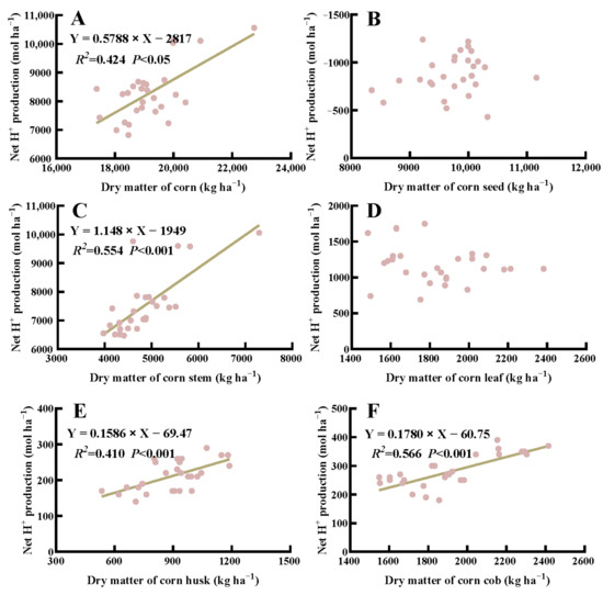 Correlation between net H+ produced by the total above-ground biomass (A), seed (B), stem (C), leaf (D), husk (E), and cob (F) of corn and the corresponding dry weight.