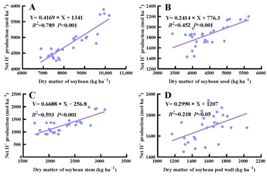Correlation between net H+ produced by the total above-ground biomass (A), seed (B), stem (C), and pod wall (D) of soybean and the corresponding dry weight.