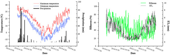 The maximum and minimum temperatures, precipitation, average relative humidity, and ET0 during the growing seasons of winter wheat and summer maize in 2018–2019.