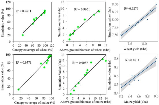 where n represents the sample size, Mi and Si represent the observed values and simulated values, respectively, and denotes the average of the observed values. R2 indicates the degree of fit between the observed and simulated values, ranging between 0 and 1. A value closer to 1 indicates a better prediction accuracy. The RMSE represents the level of deviation between the observed and simulated values, with a smaller value indicating more reliable simulation results. The closer EF and d are to 1, the higher the consistency between the simulated and observed values, indicating more accurate simulation results.