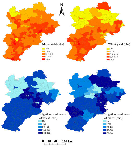 where I represents the irrigation water usage for crops in cubic meters (m3), P denotes the crop yield in kilograms (kg), Irequ indicates the net irrigation water requirement obtained from the AquaCrop model in cubic meters per hectare (m3 ha−1), Yirri represents the crop yield under irrigation conditions based on the AquaCrop model in kilograms per hectare (kg ha−1), and Yrain represents the crop yield under rain-fed conditions according to the AquaCrop model in kilograms per hectare (kg ha−1). It is important to note that winter wheat and summer maize generally require irrigation. A refers to the planting area of winter wheat and summer maize in hectares (ha), and Firri represents the proportion of irrigated agricultural land area calculated using county-level statistics data provided by the National Bureau of Statistics.