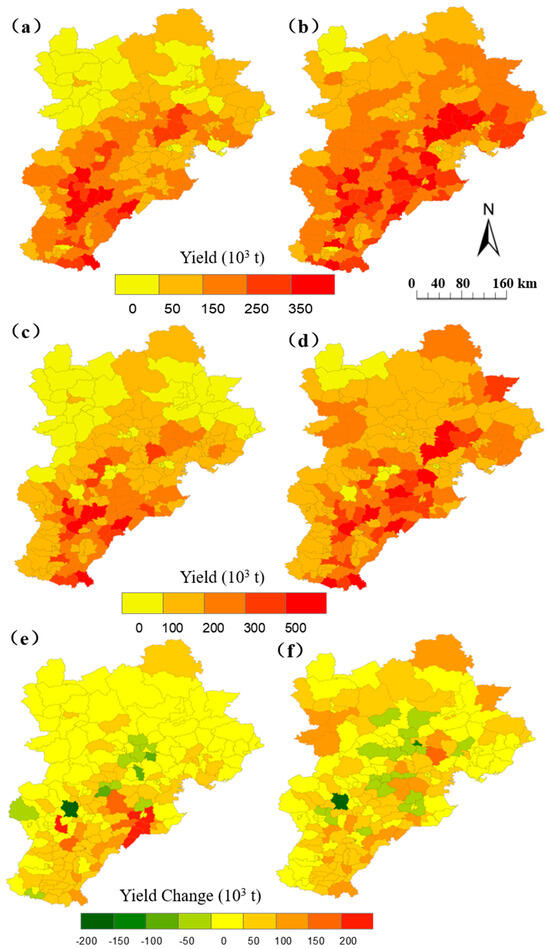 Crop yields and changes in winter wheat and summer maize production in the Beijing–Tianjin–Hebei region. Note: (a) Winter wheat yield in 2009; (b) winter wheat yield in 2019; (c) summer maize yield in 2009; (d) summer maize yield in 2019; (e) change in winter wheat yield from 2009 to 2019; and (f) change in summer maize yield from 2009 to 2019.
