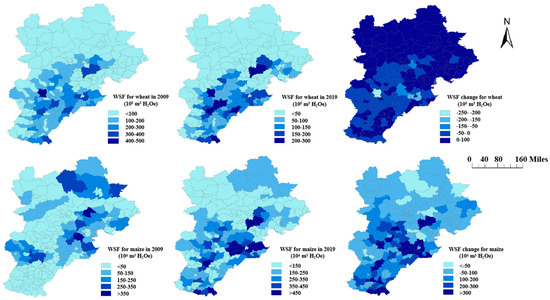 From 2009 to 2019, there was a decreasing trend in the water scarcity footprint (WSF) of winter wheat and an increasing trend in the WSF of summer maize in the Beijing–Tianjin–Hebei region (Figure 5). In 2009, the total WSF of winter wheat was 189.93 × 107 H2Oe, while in 2019, it decreased to 112.2 × 107 H2Oe, representing a decrease of approximately 40.63%. The total WSF of summer maize in the Beijing–Tianjin–Hebei region in 2019 was 329.33 × 106 H2Oe, which was approximately 1.5 times the value in 2009. The spatial distributions of the WSFs for winter wheat and summer maize followed a similar pattern to the changes in crop yields.