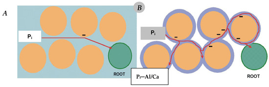 Mobility and availability of inorganic phosphorus in the soil solution under optimal ((A) field capacity) and suboptimal water conditions ((B) water deficiency-induced precipitation by Al3+ or Ca2+); the red line indicates the direction of orthophosphate ion flow in the soil solution.