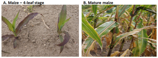 The seemingly small reduction in the water content from 27% to 22% resulted in a drastic decrease in the length of maize roots, consequently leading to a significant reduction in P uptake by plants [34]. The negative impact of water shortage on P supply to the plant can be at least partially mitigated by maintaining a higher content of available P in the soil solution. Most crop plants take up and accumulate large amounts of P during the initial growth phase, usually in optimal soil water conditions [35,36]. The high P uptake by the plant during this period, which is only apparently luxurious, increases its tolerance to water stress in the later stages of growth, which are crucial for yield formation. A classic example is maize. Phosphorus deficiency in the fourth (fifth) leaf stage, in which the structure of generative organs is formed, is reflected in the flowering stage [37]. This state is manifested by poor development or even the complete disappearance of the cob (Figure 2).