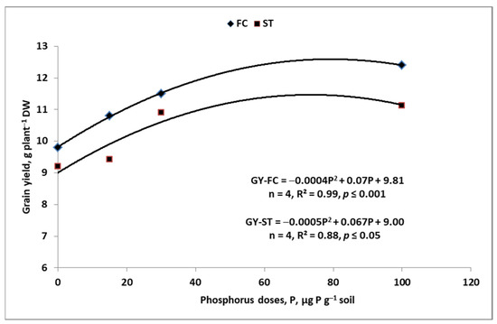 The effect of water conditions and phosphorus doses on wheat yield in a pot experiment (based on [101]). Legend: FC—field capacity; ST—water stress).