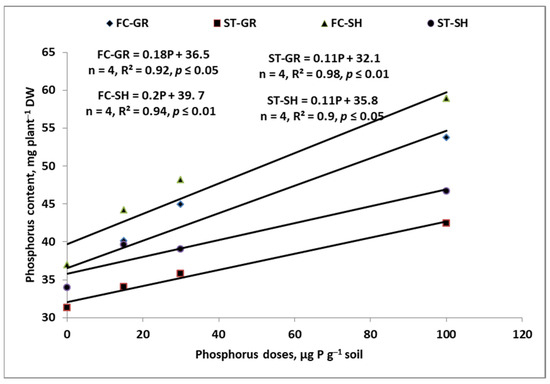 Effective management of nutrients in world regions under seasonally changing weather conditions, including in-seasonal and irregular drought sequences, is difficult. At least two aspects need to be considered. The first, strategic one assumes maintaining a high content of available P in the rooting zone of cultivated plants, especially those sensitive to P supply during the critical period of yield formation. The second, tactical one concerns fertilizer treatments, assuming lower P uptake by plants in a dry season. In light of the strategy of sustainable P management, the question arises here whether an increase in P doses or the level of the soil Pi content can alleviate, at least partly, the effect of water shortage on crop yield. As shown in Figure 4, increased doses of P under water stress in the critical period of wheat yield formation did not reduce but actually increased the yield gap, which doubled for the optimal P dose relative to the P control (0.81 → 1.65 g plant−1). However, the plant was sufficiently supplied with P, as evidenced by a linear increase in the P content in both shoots and grain (Figure 5). Wheat plants under water stress, regardless of the P dose, contained more P in both straw and grain. The key difference between well-watered and water-stressed plants was the number of grains per plant, which was lower in plants subjected to water stress [101]. This simple experiment allows us to formulate two general conclusions. The first is consistent with Körner’s hypothesis [102] that nutrient resources, in this case referring to P, accumulated in the pre-flowering period by the crop plant will not be used when the sink capacity is too low. The second conclusion indicates the need to create growth conditions for at least full exploitation of P resources in the plant. This is possible, provided the sink is large [41].