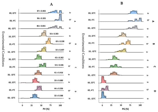 The assessment of pollen viability and in vitro pollen germination revealed substantial variability among different genotypes with different a storage time (ST) and temperature conditions, as depicted in Figure 1 and Figure 2. Histograms illustrating pollen viability exhibited pronounced variation regarding storage duration (Figure 3). Freshly collected pollen (with no storage, 0 days) exhibited the highest pollen viability percentages across all 50 spring wheat genotypes. The pollen viability percentages ranged from 71% to 100% for these fresh samples (Figure 1A−D and Table S3). Similarly, in vitro pollen germination rates ranged from 63% to 98.6% for the same fresh pollen samples (Figure 2A,B and Table S3). Notably, for all genotypes and under all storage temperature conditions, both in vitro pollen germination and pollen viability exhibited significant decreases as the storage time elapsed (Figure 3; Tables S2 and S3).