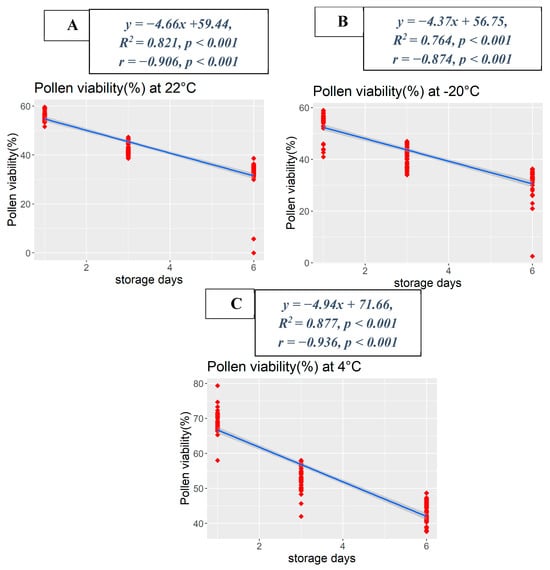 Linear regression analysis revealed significant linear regressions between pollen viability and the storage day at various storage temperatures, namely 22 °C, −20 °C, and 4 °C (Figure 4A–C). Simple linear regression analysis demonstrated notably strong correlations, with R2 values of 0.821 (p < 0.001) at 22 °C, 0.764 (p < 0.001) at −20 °C, and 0.877 (p < 0.001) at 4 °C. Negative regression results indicated that pollen viability declined with an increase in storage time. The maximum pollen viability on the first day of storage was demonstrated to be 55%, 52%, and 66% at 22 °C, −20 °C, and 4 °C, respectively. After 3 days of storage, pollen germination decreased to 47%, 44%, and 58% at 22 °C, −20 °C, and 4 °C, respectively. Subsequently, on the 6th day of storage, germination rates reduced to 31.5%, 31%, and 43% at 22 °C, −20 °C, and 4 °C, respectively. These results underscore that pollen germination was notably higher at the 4 °C storage temperature compared with the temperatures of 22 °C and −20 °C across the different storage durations.