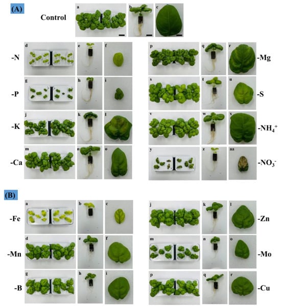 Symptoms of nutritional deficiencies of basil leaves and roots regarding (A) macronutrients and (B) micronutrients. Scale bars in (A) -a, -b, and -c refer to 3 cm, 3 cm, and 1 cm, respectively, and were applied to other corresponding groups.