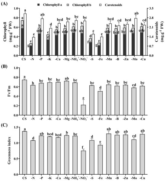 On the whole of Figure 3, as compared to the basil plants grown in the CS regime, the photosynthetic capacity to varying degrees declined, regardless of the nutrient omission treatments, in particular of the plants that developed chlorosis, such as -N, -P, -S, -Fe, etc. Take the omission of S as an example. The chlorophyll a, b, and carotenoids of S-deficiency plants significantly decreased 51.7%, 52%, and 49.1%, respectively, when compared to the plants grown in CS (Figure 3A). The Fv/Fm value of -N, -P, -K, -Ca, -NO3−, -S, and -Fe remarkably diminished by 15%, 9.2%, 7.4%, 6.6%, 70.9%, 15.9%, and 32.2%, respectively (Figure 3B). Meanwhile, the greenness index of -N, -K, -Ca, -NO3−, -S, -Fe, and -Mo significantly reduced 21.2%, 12.4%, 14.6%, 45.3%, 21.2%, 32.1%, and 19.7%, respectively (Figure 3C).