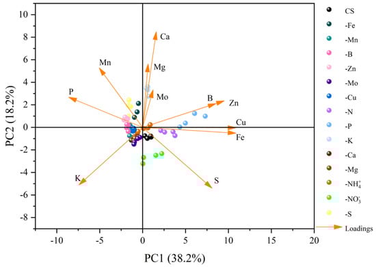In addition, P-omitted and N-omitted solutions-treated plants possessed higher contents of Fe, Cu, Zn, and B; K-deficiency-treated plants displayed higher contents of Ca and Mg, presenting a negative correlation of the NO3−-deficiency counterparts (Figure 6 ‘PC2’). Also, the distributions of S-deficiency samples were similar to the Fe deficiencies, simultaneously exhibiting a relatively higher content of Mn.