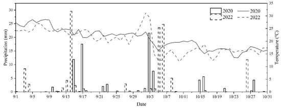 Temperature and precipitation (mm) during September and October in 2020 and 2022.