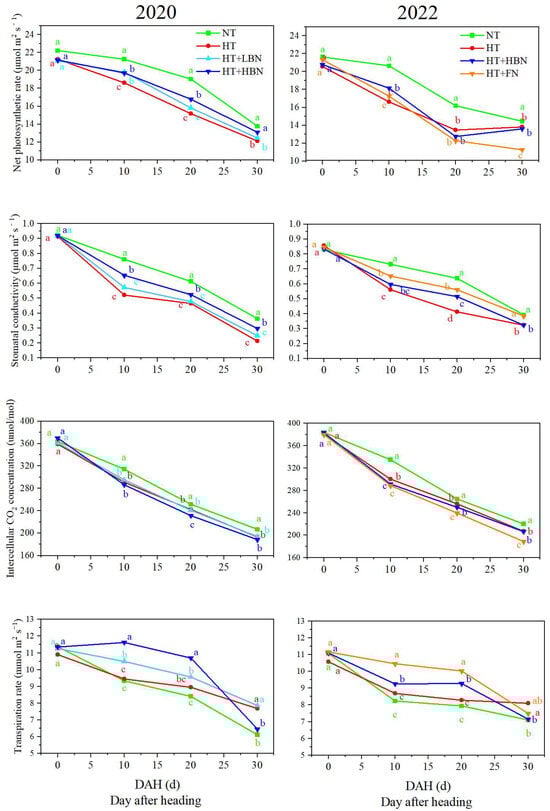 Effects of nitrogen fertilizer at heading stage on photosynthetic parameters of flag leaf of rice under high temperature during grain-filling period. Note: different letters after the data in the same column indicate significant differences at the p < 0.05 level. NT, normal temperature; HT, high temperature; HT + LBN, high temperature + low-broadcast nitrogen fertilizer application level at heading; HT + HBN, high temperature + high-broadcast nitrogen fertilizer application level at heading; HT + FN, high temperature + foliar nitrogen fertilizer application at heading.