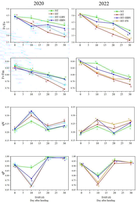 No significant difference was observed in chlorophyll fluorescence parameters among treatments at the heading stage (Figure 3). Fv/Fo, Fv/Fm and qP all showed the highest values at the heading stage. Compared with NT, HT significantly reduced Fv/Fo and Fv/Fm after heading in both years except for Fv/Fm at 10 DAH in 2020, and HT also decreased qP at 10 DAH and 20 DAH in two experimental years, but the qP difference between the two treatments did not reach a significant level in 2020. HT significantly enhanced qN after heading in both experimental years relative to NT. In 2020, Fv/Fo and Fv/Fm of HT + LBN and HT + HBN showed a decreasing tendency or no clear change at 10 DAH, respectively, compared with HT, but they both showed higher values than those under HT at 20 DAH and 30 DAH. LBN did not induce a significant change in qP under HT in 2020, whereas HBN significantly enhanced qP at 10 DAH in 2020. Under high temperatures, LBN and HBN both significantly increased qN at 10 DAH, and HBN significantly reduced qN at 20 DAH and 30 DAH, compared with that without nitrogen fertilizer application. In 2022, both HBN and FN significantly increased Fv/Fo and Fv/Fm after heading when rice was grown under high temperatures. qP was enhanced by HT + HBN and HT + FN at 10 DAH and 20 DAH relative to HT. qN was significantly increased by HT + FN at 10 DAH, 20 DAH and 30 DAH, compared with HT, while it was significantly increased and decreased by HT + HBN at 10 DAH and 20 DAH in comparison with HT, respectively.