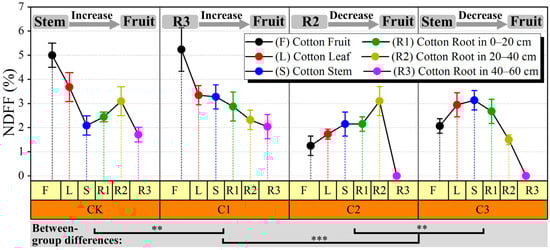 The NDFF, commonly interpreted as the proportion of nitrogen (N) absorbed by crops originating from 15N-labeled urea, serves as a measure of the extent to which the amount of 15N-labeled fertilizer absorbed and distributed by crops contributes to the total nitrogen content of the organ. By discerning the distribution of 15N isotopes, the capacity of different crop organs to uptake and regulate nitrogen from 15N-labeled fertilizer can be assessed. Notably, the NDFF of cotton roots in the C2 and C3 treatments exhibited a significantly lower value compared to the other treatments within the 40–60 cm soil layer (Figure 2). Nevertheless, no significant difference in NDFF between the treatments in the 0–20 cm soil layer was detectable (p > 0.05), with values ranging from 2.1% to 2.6%, respectively. The soil salt stress resulted in smaller differences in the NDFF of the control treatment and C1, with a range of 0.3% to 0.8%. However, the disparity in cotton fruits between the control treatment and C4 treatments was 2.8%. As the soil salt stress increased from the control treatment to C1, the capacity of cotton stems and fruits to uptake and regulate nitrogen strengthened gradually, while the leaves decreased slightly. The NDFF of cotton aboveground organs (stem, leaf, and fruit) in the C2 treatment exhibited a significant decrease compared to the other three treatments. This observation suggests that the capacity of cotton to uptake and regulate nitrogen was weakened under the C2 treatment, or alternatively, it suggests that the direct contribution rate of fertilizer to cotton was the least pronounced under C2 conditions.