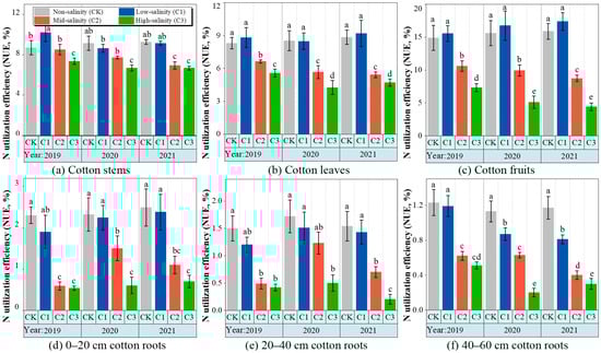 The changes in nitrogen utilization efficiency in different organs of cotton under soil salt stress from 2019 to 2021. See Figure 2 for abbreviations of reclamation types.