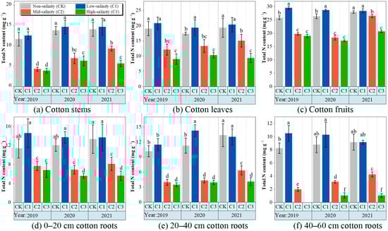 The changes in total nitrogen content in different organs of cotton under soil salt stress from 2019 to 2021. CK, non-salinity; C1, low salinity; C2, mid-salinity; and C3, high salinity. values followed by different letters in the same column are significantly different at p < 0.05 (LSD test).