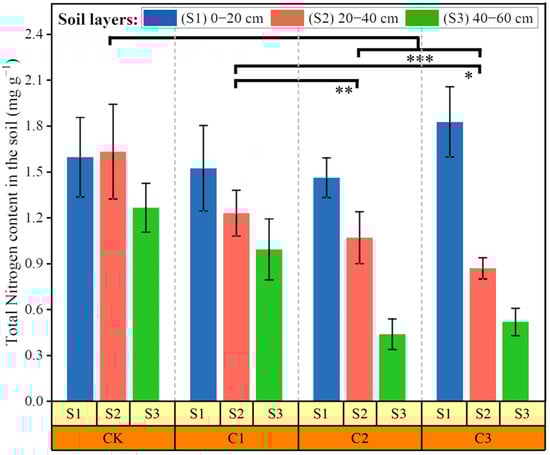 The amount of total nitrogen content in the soils: S1, 0–20 cm soil layer; S1, 20–40 cm soil layer; and S3, 40–60 cm soil layer.