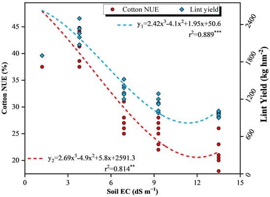 The regression analysis between cotton lint yield, nitrogen use efficiency (NUE), and soil electrical conductivity (EC) is depicted in Figure 6 through regression analysis. The results indicate significant quadratic correlations (p < 0.01) between the lint yields of cotton (y2, %) and soil EC (x, dS·m−1), and soil EC (x, dS·m−1), as well as between cotton NUE (y1, %) and soil EC (x, dS·m−1). Specifically, when cotton NUE (y1, %) and lint yields (y2, %) reached 95% of the theoretical maximum value, the soil EC was 4.2 and 3.7 dS·m−1; while the cotton NUE (y1, %) and lint yields (y2, %) reached 90% of the theoretical maximum value, the soil EC was 4.1 and 5.6 dS·m−1.