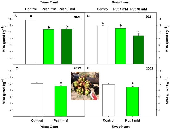 (A,C) MDA content (µmol kg−1) in ‘Prime Giant’ and (B,D) ‘Sweetheart’ cultivars in flower buds treated with putrescine (1 and 10 mM) and control samples evaluated in 2021 and 2022. Data are the mean ± standard error (n = 3). In 2021, different lowercase letters indicate significant differences (p < 0.05) among treatments for each cultivar. In 2022 study, (*) indicates significant differences between putrescine-treated and control samples for each studied cultivar (Student’s unpaired t-test; * p < 0.05).