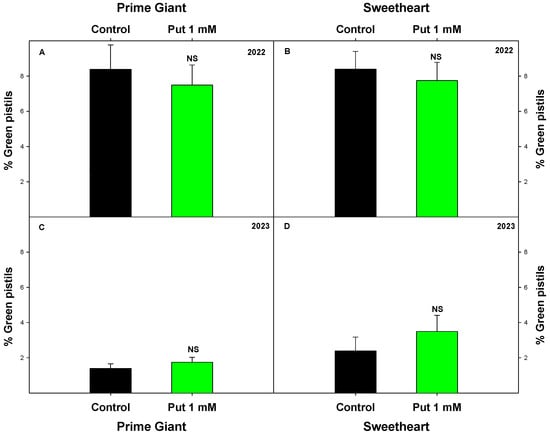 (A,C) Percentage of green pistils in ‘Prime Giant’ and (B,D) ‘Sweetheart’ cultivars in flower buds treated with putrescine (1 mM) and control samples evaluated in 2022 and 2023. (Student’s unpaired t-test; NS: non-significant differences between putrescine-treated and control samples for each studied cultivar).