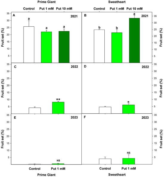 (A,C,E) Fruit set percentage in ‘Prime Giant’ and (B,D,F) ‘Sweetheart’ cultivars in fruit treated with putrescine (1 and 10 mM) and control samples evaluated in 2021, 2022, and 2023. In 2021, different lowercase letters indicate significant differences (p < 0.05) among treatments for each cultivar. In 2022 and 2023. (*) indicates significant differences between putrescine-treated and control samples for each studied cultivar (Student’s unpaired t-test; * p < 0.05, ** p < 0.01, NS: non-significant).