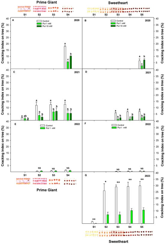 (A,C,E) Cracking incidence during development on tree (%) in ‘Prime Giant’ and (B,D,F,G) ‘Sweetheart’ cultivars in fruits treated with putrescine (1 and 10 mM) and control samples evaluated between 2020 and 2023. Data are the mean ± standard error (n = 3). In 2020 and 2021, different lowercase letters indicate significant differences (p < 0.05) among treatments for each cultivar. In 2022 and 2023, (*) indicates significant differences between putrescine-treated and control samples for each studied cultivar (Student’s unpaired t-test; * p < 0.05, ** p < 0.01, NS: non-significant).