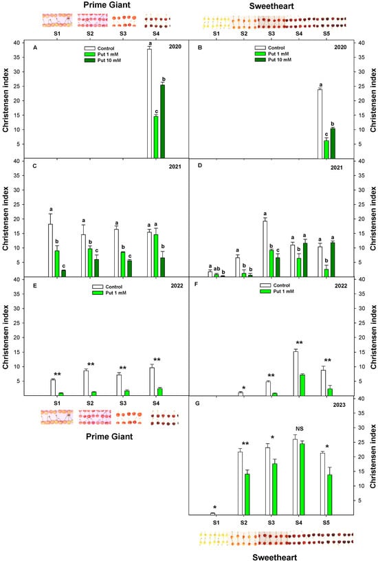 (A,C,E) Christensen index during development on tree in ‘Prime Giant’ and (B,D,F,G) ‘Sweetheart’ cultivars in fruit treated with putrescine (1 and 10 mM) and control samples evaluated between 2020 and 2023. Data are the mean ± standard error (n = 3). In 2020 and 2021, different lowercase letters indicate significant differences (p < 0.05) among treatments for each cultivar. In 2022 and 2023, (*) indicates significant differences between putrescine-treated and control samples for each studied cultivar (Student’s unpaired t-test; * p < 0.05, ** p < 0.01, NS: non-significant).