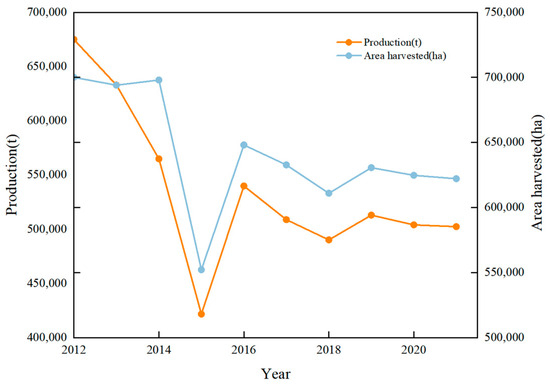 The trend of changes in the harvested area and production of buckwheat in China from 2012 to 2021.