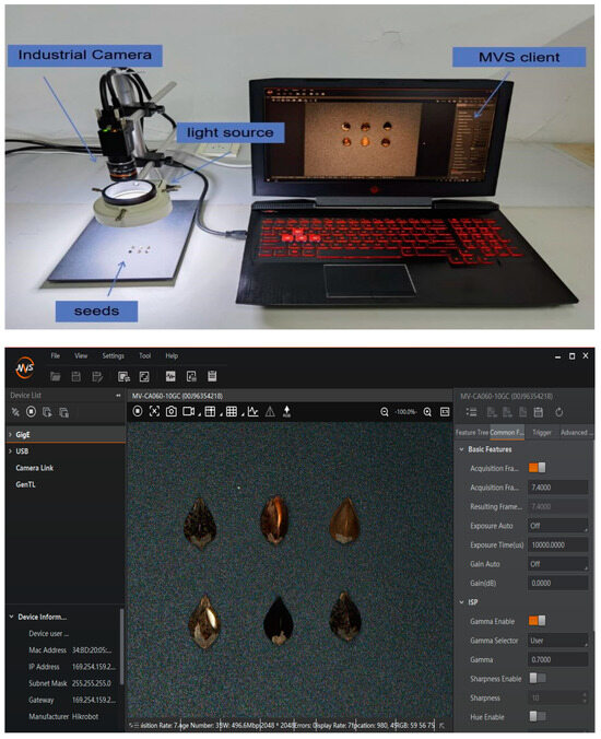 The image acquisition system used in this study includes a computer, camera, and light source. The camera chosen is a Chinese Hikvision Gigabit Ethernet industrial line scan camera, positioned parallel to the desktop at a height of 14 cm. The copyright of the camera belongs to Chinese Hangzhou Hikang Robot Technology Co., Ltd. or its customs Associated company. A circular LED light with adjustable brightness is fixed below the camera on a support at a height of 7 cm, set to constant brightness, and designed to ensure uniform lighting for high-quality seed images. Seeds are placed beneath the system, and the images are uploaded to the MVS client in real time, with the camera operated using computer control. This acquisition system is the camera supporting system, as shown in Figure 2.