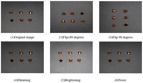 To meet breeding requirements, it is necessary to ensure the purity of Hongshan buckwheat seeds. Therefore, the seeds are classified into four categories, as shown in Figure 3, including complete and with clear texture; complete but with unclear texture; complete without texture; and broken, which were, respectively, represented by WL, WLBMX, WWL, and PS in the experimental results. The uneven distribution of the original buckwheat seeds can lead to errors in training. To ensure the diversity of the dataset and prevent overfitting caused by an imbalanced sample distribution, it is necessary to preprocess the original data. Data augmentation was carried out in this study using the following process, as shown in Figure 4.