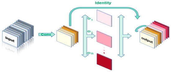 The Ghostnet module can be divided into three parts. The first part is a normal convolution operation. The second part is a grouped convolution operation, which can generate a portion of the feature maps below the output feature map. The third part is a recognition process that adds the number of channels corresponding to the feature maps obtained from the first part of the convolution and the channels obtained from the second part of the grouped convolution. Φn is a linear transformation in the module.