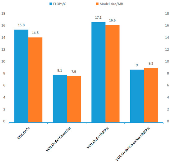 To validate the lightweightness of the models, the FLOPs and model sizes of different models were compared, as shown in Figure 11. Compared to YOLOv5s, YOLOv5s+GhostNet+BiFPN reduces the FLOPs by 6.8 G and decreases the model size by 5.2 MB. Compared to YOLOv5s+BiFPN, it lowers the FLOPs by 8.1 G and decreases the model size by 7.3 MB. As for YOLOv5s+GhostNet, the values slightly increase. The training results for all the seed data from the three models are shown in Figure 12. The YOLOv5s+GhostNet+BiFPN model demonstrates better precision, recall rate, and mAP compared to the other models, meeting the requirements of lightweight models while ensuring higher detection precision in seed detection.
