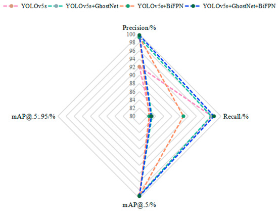 To validate the experimental results of the improved YOLOv5s model, ablation experiments were conducted using metrics such as precision, recall, and mAP, and the time-consuming aspect was compared. As shown in Table 2, “√” means using the corresponding method to improve the model, and “-” means not using the corresponding method. Both the added GhostNet and BiFPN modules contribute to the performance of the model. The original model exhibits relatively low precision in identifying broken and blurry buckwheat seeds. Moreover, there is a significant disparity in recognition precision between different categories, with a higher precision in identifying seeds without textures but a lower recall rate.