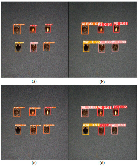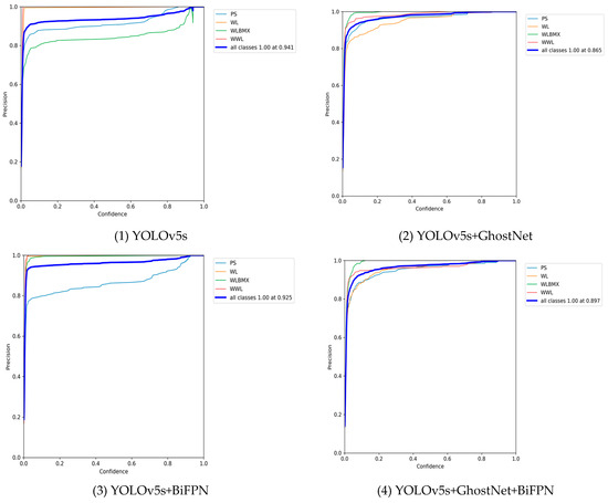 - The YOLOv5s+BiFPN model and the YOLOv5s+Ghost model have higher detection precision than the YOLOv5s model. Specifically, in the recognition of WLBMX, the precision improvement of the YOLOv5s+BiFPN model and the YOLOv5s+Ghost model is significant.