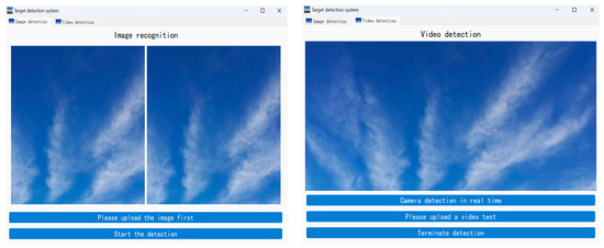 Based on the comparison and data analyses of multiple recognition models, combined with the experimental results and theoretical knowledge of the previous sections, a broken Hongshan buckwheat recognition system based on an improved YOLOv5s model was designed and constructed using computer programming techniques. The system was designed with a PyQT5 interface and required the model to be replaced with a trained model by modifying the address of the used model before creating the interface. The interface design includes two parts: image detection and video detection. Image detection requires uploading photos of buckwheat seeds that have been taken and then clicking on “Start Detection” to identify them. Video detection includes real-time camera detection and uploaded video detection. Real-time camera detection can automatically recognize the seeds by calling the computer’s camera, while uploaded video detection can detect recorded seed videos. The composition and workflow of the system are shown in Figure 14.